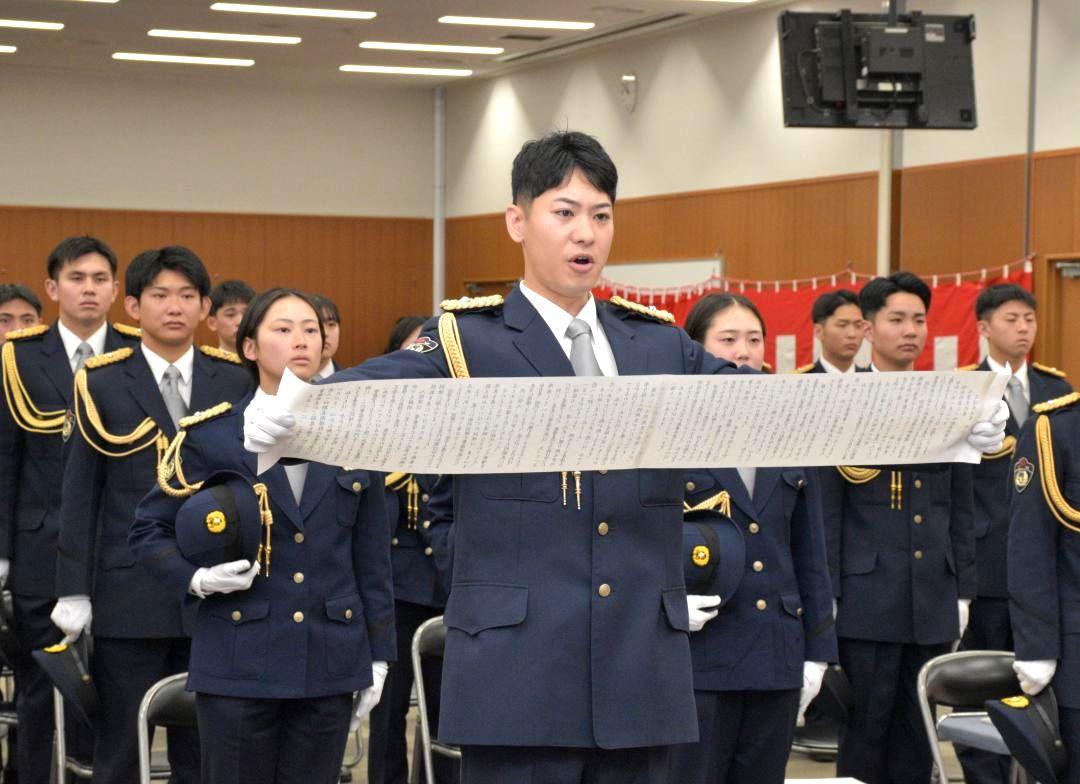 茨城県茨城町上石崎の県警察学校(菊地政次校長)で30日、初任科の卒業式が開かれた。答辞で野上弦汰巡査(25)が職務にまい進する…
