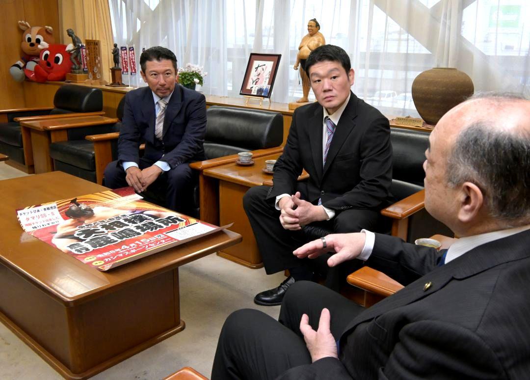 茨城県鹿嶋市神向寺のカシマスポーツセンターで15日に開く大相撲春巡業鹿行鹿嶋場所に向け、日本相撲協会の谷川親方(元関脇北勝…