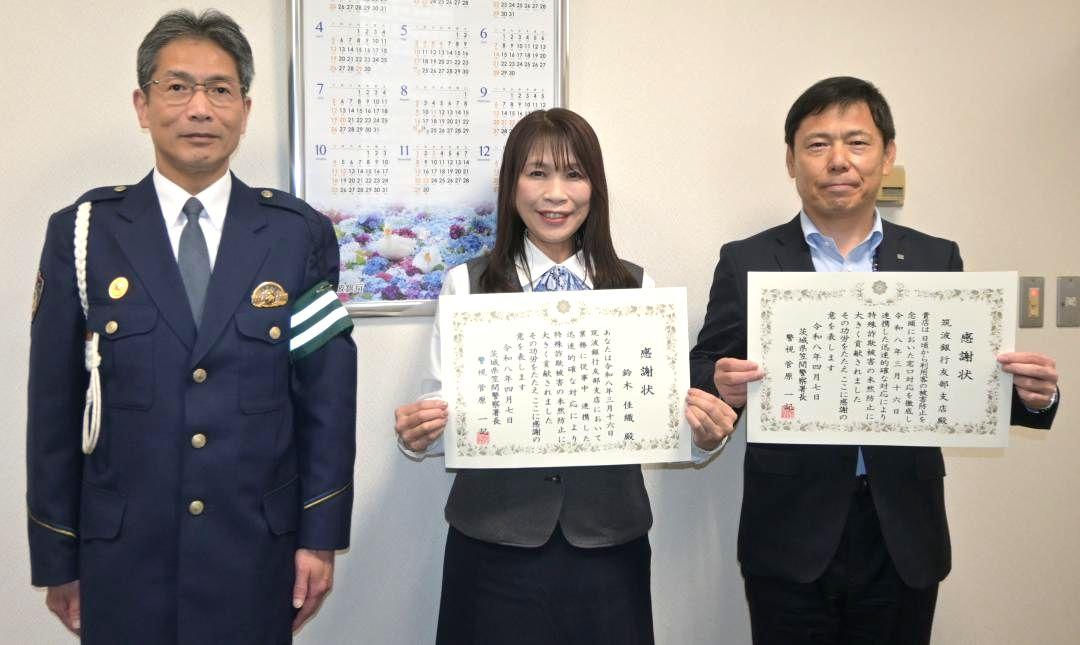 特殊詐欺の被害を未然に防いだとして、茨城県警笠間署(菅原一記署長)は7日、同県笠間市美原の筑波銀行友部支店(根本光雄支店長)…