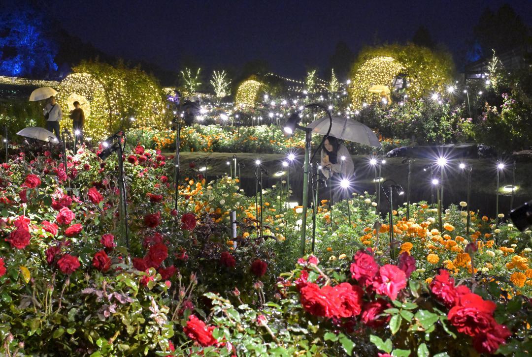 茨城県石岡市下青柳のいばらきフラワーパークのライトアップイベント「ムーンライトローズガーデン2025」が11日、始まった。見…