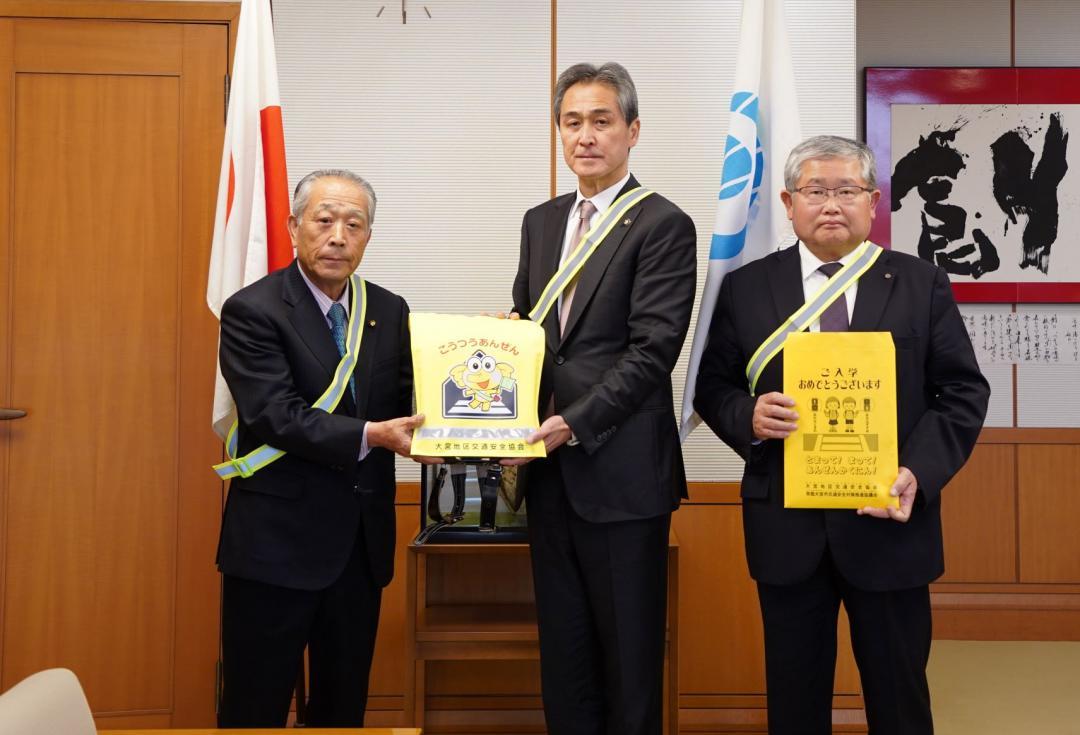 新しい環境で通学する小中学生の交通安全を願い、茨城県常陸大宮市の大宮地区交通安全協会(秋山信夫会長)は3月25日、市内小中学…