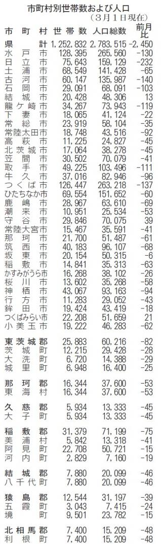 茨城県は4月1日までに、3月1日現在の県人口をまとめた。総人口は278万3515人となり、2月1日と比べ2450人減った。 2月中に自…