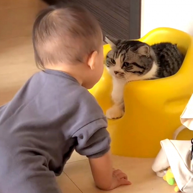 赤ちゃんvs猫、椅子を奪い合う仁義なき戦いに200万回再生「むちむちともふもふの戦い」「優しいパンチ」