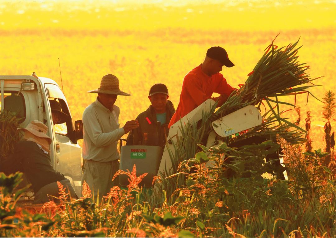「朝日を浴びて」は、日の出直後のまばゆい光の中で、長ネギの収穫作業をする技能実習生。光の使い方と場面の切り取り方に気を配ることで、外国で撮影したような雰囲気に仕上がっています。(写真映像部)