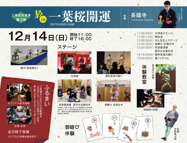 11/15~12/14の期間で行ってきた中央区・台東区連携イベント最終日は、浅草北部の長國寺会場で行う。ステージ(太神楽、和楽器演奏、葭町芸者の踊り、狐舞ひ、けん玉名人)、昔遊び体験(あやとり、けん玉、射的、富くじ)、体験教室(版画刷り、苔玉作り)、盆栽展示など。先着で甘酒・お茶・オリジナル金太郎飴の振る舞いもあり。