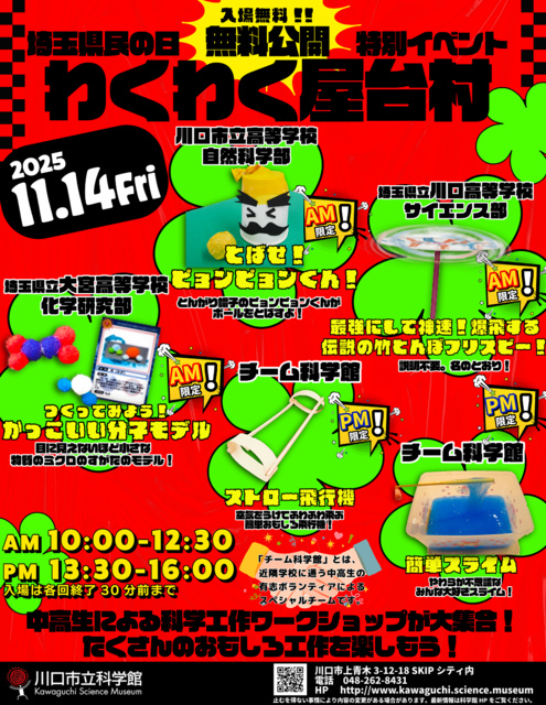 科学館が無料で楽しめる特別な日。科学展示室では中学・高校生によるいろいろなものづくりを楽しめる「わくわく屋台村」を開催。プラネタリウムでは、星空の生解説や2024年冬番組「いのちの源~コズミッククルーザーで行く驚異の太陽~」、2025年春番組「スターリースカイ 天空に舞う星座たち」を楽しめる(要無料観覧券)。「天文台特別ガイドツアー」では、副天文台での太陽観測を中心に3つの天文台を案内。
