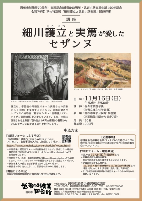 護立は学習院の同級生であった実篤らとの交友から『白樺』を支援するとともに、実篤の勧めでセザンヌの油彩画「帽子をかぶった自画像」(現・アーティゾン美術館蔵)を入手している。また、今展に展示される水彩画「登り道」(永青文庫蔵)や書簡から、2人のセザンヌにかける思いを紹介。事前要申込(11/2(日)17時まで)、定員は30名(多数抽選)。
