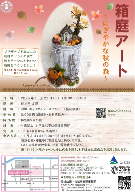 プリザーブド加工した花材やドライの実で、秋をテーマにしたかわいい箱庭を作る。11月2日(日)~11月15日(土)に電話またはFAXで花畑公園・桜花亭事務所に申込。FAXの場合は教室名、氏名、電話番号を記入。11/16以降のキャンセルは代金を支払い、材料または完成品を受け取る。