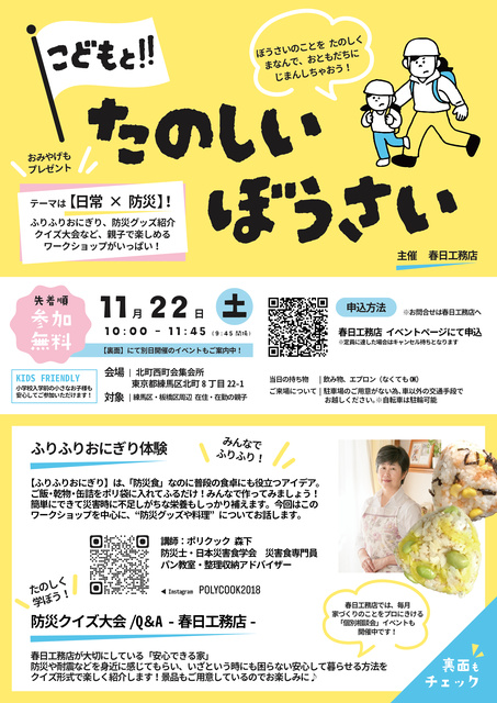 「日常 × 防災」をテーマに親子向けのワークショップをおこなう。内容は、ふりふりおにぎりや防災料理&グッズ紹介・防災クイズ大会。嬉しいおみやげ付き。先着順の為予約は早めに! KIDS FRIENDLY:小学校入学前の小さな子供も安心して参加可能。会場の受入人数の関係により定員に達した場合はキャンセル待ちとなる。
