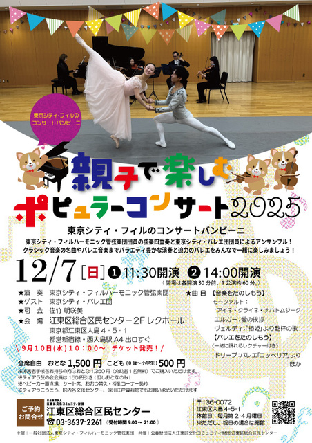 0才から入場OK!弦楽四重奏によるクラシックの名曲やバレエとの共演、クリスマススペシャルメドレーなどもりだくさんのコンサート。演奏者との距離が近いステージを楽しもう。※シート席・椅子席、ベビーカー置き場、おむつ替え、授乳コーナーあり。演奏:東京シティ・フィルハーモニック管弦楽団 弦楽四重奏、ゲスト:東京シティ・バレエ団 団員、司会:佐竹明咲美