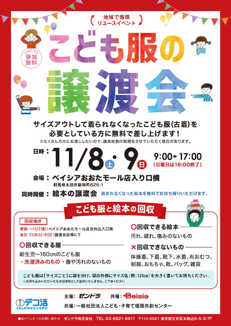 新生児~160cmまでのこども服を無償で譲る。不要になったこども服や絵本は捨てずに回収に持っていこう!(傷・汚れ、玩具、かばん、靴は除く)この無料譲渡会は、ベイシアとゼンドラ株式会社が共同で開催する誰でも参加可能なリユースイベント。サイズアウトしたこども服を次世代に橋渡しし、地域内循環やごみの減量など、地域の皆様のために少しでも役に立ちたいとの思いから活動している。