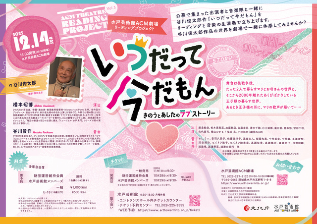 詩人・谷川俊太郎の戯曲『いつだって今だもん-きのうとあしたのラブストーリー』を、公募で集まった出演者・音楽隊と一緒に、リーディングと音楽の生演奏で上演する。演出は茨城県ひたちなか市出身の演出家・橋本昭博。音楽は谷川賢作。