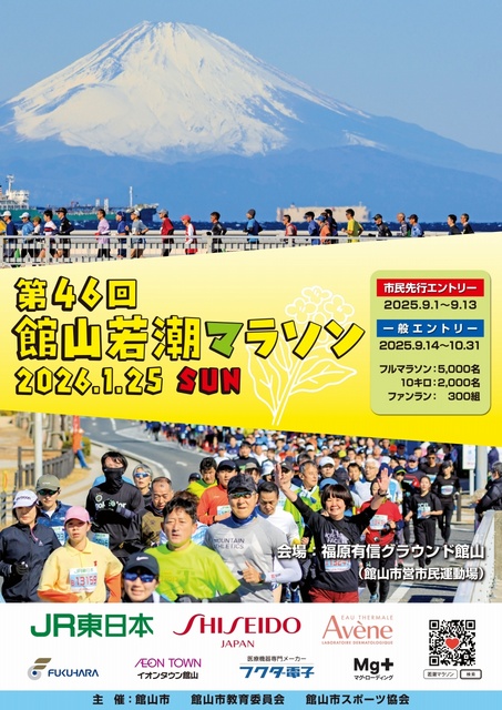 種目はフルマラソン・10キロ・ファンラン(2キロ)の3つ。マラソンコースは房総の海岸線、フラワーラインの菜の花など自然豊か。冬の朝、天気のいい、空気の澄んだ日には、海越しに富士山も見られる。11/13まで申込み受付。マラソン大会当日は館山市内で交通規制が行われるので要注意。