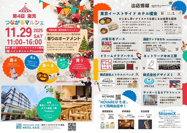 第4回「潮見つながるマルシェ」を東京イーストサイド ホテル櫂会で開催。グーラッシュ(牛肉のシチュー)やホットワインなど冬のヨーロッパを感じるメニュー、子供駅長制服体験、電車おもちゃ展示、革製品や陶器など多彩なブースが登場。マジックショーや学生プロジェクトも必見! NOVAREひろばで同時開催イベントもあり、潮見でクリスマス気分を満喫できる一日。