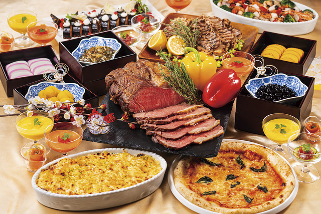ホテルのシェフが腕によりをかけたブッフェ料理を家族で楽しもう。ローストビーフのライブキッチンあり。新年の始まりにふさわしいおせち料理も登場! 充実のデザートや子ども向けの料理も用意している。初詣のお帰りの際などに立ち寄ろう。