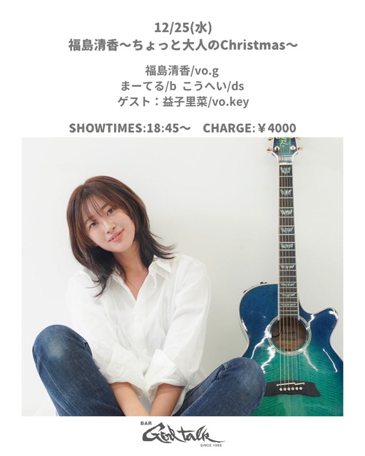 福島清香が贈る華やかなクリスマスライブ。特別なひと時を一緒に過ごそう。バンドセットで豪華にお届け。ちょっとしたプレゼントもあるかも? ゲストに茨城出身シンガーソングライターの益子里菜を迎えて、一夜限りのコラボにも注目。