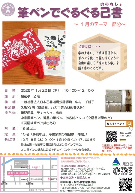 テーマは「節分」。筆ペンで自由に好きな言葉や絵を描く。初心者でも楽しく描ける。12月18日(木)~1月10日(土)に電話またはオンラインで花畑公園・桜花亭事務所に申込。事前申込で、応募多数の場合は抽選。