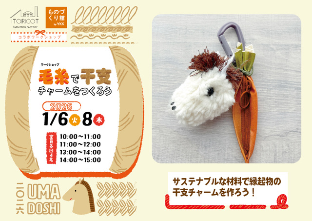 今回はイトリコの毛糸を使用し、2026年の干支である馬と人参型ポーチを作成。毛糸を紙に巻いて毛玉を作った後、ハサミで馬型に整える。目は手縫いで付ける。人参型ポーチはアイロン接着テープを使ってファスナーを貼り付け。参加目安は6歳以上。自社工場内で廃棄する樹脂材料を使った廃材樹脂カラビナ制作体験もできる。縁起物といわれる干支のチャームを作って素敵な1年のスタートを迎えてみるのはいかが?