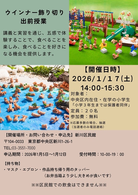日本ハムカスタマーコミュニケーション株式会社のみなさまの協力を得て、ウインナー飾り切り出前授業を開催。講義と実習を通じ、五感で体験することで、食べることを楽しみ、食べることを好きになる食育講座。区民館での飲食はできないため、出来上がった作品は持ち帰る。1月5日~12日10:00~19:00の間に電話にて申込。応募者多数の場合は抽選。