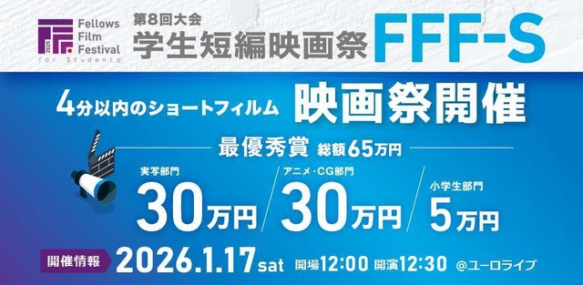 学生短編映画祭FFF-Sとは? 株式会社フェローズが主催する学生の為の「短編映画祭」。国内の学生を対象に4分以内のショートフィルムを募集し、コンペティションを開催。今年から新たに「実写部門」「アニメ・CG部門」「小学生部門」を設け、部門ごとに最優秀賞・各賞を決定。一次審査を通過した入賞作品は都内の映画館にて上映される。