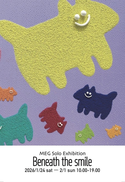 2026年新春、モンキーギャラリー初となるMEGの個展を開催。生クリームを絞り出すかのように絵の具を重ねる技法で、やわらかくカラフルな世界を生み出す。無邪気に微笑む動物たちの表情には、それぞれ異なる感情がひそみ、人の「表」と「内なる心」をやさしく表現する。この機会に作品と向き合いながら、自分の心にもそっと目を向ける時間を楽しもう。