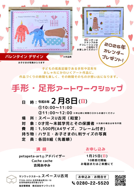 こどもの成長記録である手形や足形でかわいい作品を作る。作品作りの時間も楽しく、その時間そのものが想い出になる。今回はバレンタインデザイン(自由製作も可能)作品はA4サイズ(フレーム付き)。持ち物はL版サイズの子どもの写真・ハサミ。定員は各回8組(先着順)。申し込みは1月25日(日)10時より電話受付開始(TEL0280-22-5520)