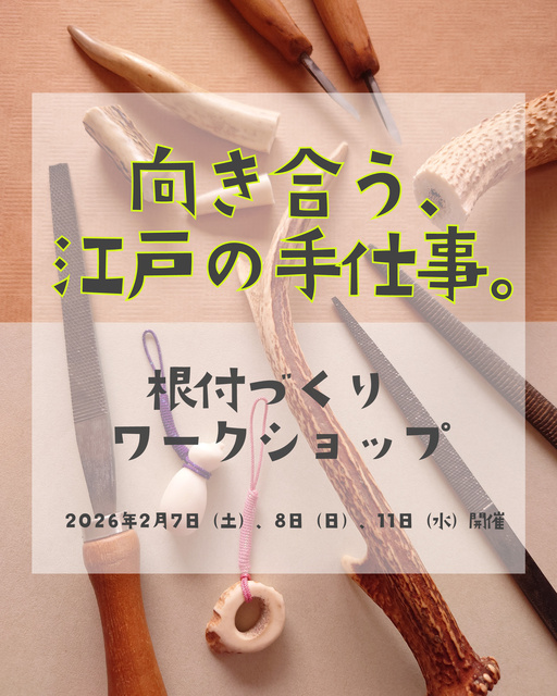 鹿角に触れ、やすりで少しずつ形を整える。根付師・関根蕪と体験する、江戸の手仕事のワークショップ。制作はやすりを使った工程が中心で、刃物は使用しない。講師が手元を見ながら進めていくので、初めての人でも安心して参加できる。制作する根付は、「輪っか形の根付」と「瓢箪の根付」の2種類から選択可能。友達同士、カップル、親子での参加も歓迎!