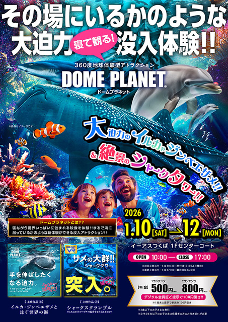 イーアスつくばにてドームプラネットツアーズを開催する。ドームプラネットツアーズとは、最新の3D360度VRが体験できる『イマーシブアクアリウム』と、エアドームの中で全天周360度の映像体験ができる『ドームプラネット』、2つの没入体験を組み合わせた、まるでその場にいるかのような映像体験ができる没入体験イベントである。今回は「イルカ・ジンベエザメと泳ぐ世界の海」と「シャークスクランブル」を上映する。