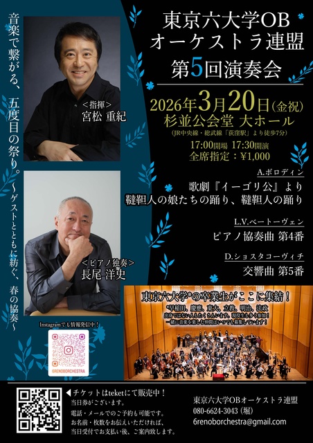 第5回演奏会は、宮松重紀の指揮のもと、ボロディン『イーゴリ公』より韃靼人の娘たちの踊りと韃靼人の踊り、長尾洋史を迎えたベートーヴェンのピアノ協奏曲第4番、そしてショスタコーヴィチ交響曲第5番という名曲揃いのプログラム。アマチュアながらも確かな演奏技術と熱意にあふれるオーケストラが、ロシア・ロマン派から近現代までの多彩な音楽を情感豊かに響かせる。