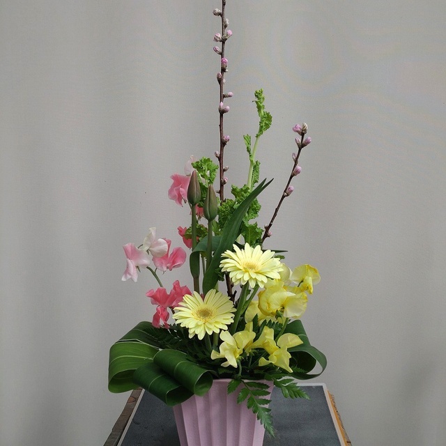 ひな祭りをイメージして、アレンジメントを作る。春の花を使ったアレンジメントを飾って、桃の節句をお祝いする。要オンライン予約。