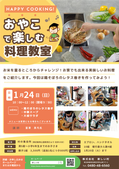 料理好きの子ども、これからチャレンジしてみたい子ども達と一緒に、親子で楽しむ料理教室を開催する。お米を計って研ぐところからやってみよう!栄養価の高い旬の食材を使い、季節に合わせた料理を紹介する。メニューは鶏そぼろご飯のレタス巻き・中華スープ・大根サラダ。 ※メニューは変更になる場合あり
