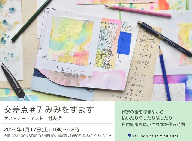 今回の交差点では、アーティスト・林友深さんとおしゃべりしながら、思いついたことをメモしたり、色を重ねたり、紙を切ったり貼ったり。決まった正解はなく、思うままに手を動かす。最後は、それらを一冊の小さな本に綴じる。上手につくることよりも、「いまの自分」を残すことを大切にしたワークショップ。アートに詳しくなくても、本づくりが初めてでも大歓迎。小さな発見が生まれたら嬉しい!