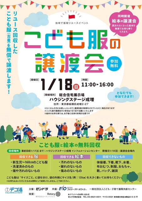 まだまだ着られる新生児~160cmまでのこども服を無料で譲渡。不要になったこども服は捨てずに回収に持っていこう! この無料譲渡会は、株式会社ファジー・アド・オフィスとゼンドラ株式会社が共同で開催するイベント。サイズアウトしたまだまだ着られるこども服を必要な世代へ橋渡しし、地域内で循環させながら、ごみの減量など、少しでも役に立てたらという思いで活動している。