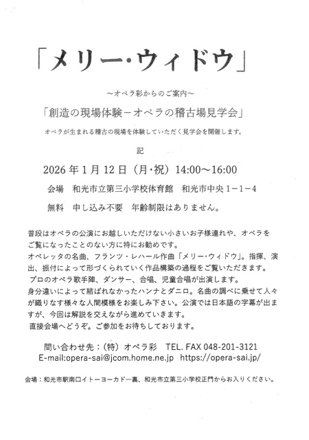 ウィンナオペラの白銀の時代のきっかけとなった名作「メリーウィドウ」、有名なアリアや重唱あり、合唱あり、実力派オペラ歌手、合唱、児童合唱が多数出演する。この機会にオペラづくりを体験し、オペラの愉しさ、醍醐味を味わってみよう。直接会場へ。