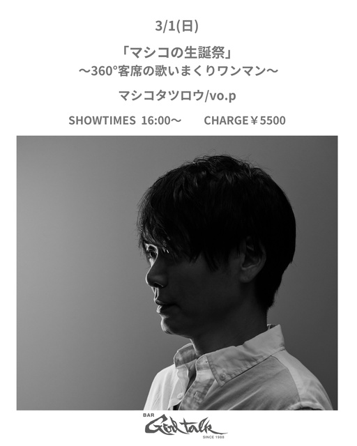 マシコタツロウは茨城県常陸太田市出身。一青窈の1stシングル「もらい泣き」で作曲家デビューし「ハナミズキ」が大ヒット、2004年、コロムビアミュージックよりメジャーデビュー。茨城県出身者、県内学校の校歌や自治体のテーマソングを制作している。「なりたてほやほやの誕生日当日! 新鮮な48歳マシコに会いに行こう。客席に360度包囲されたピアノ弾き語りスタイルで送る。マシコタツロウ」。