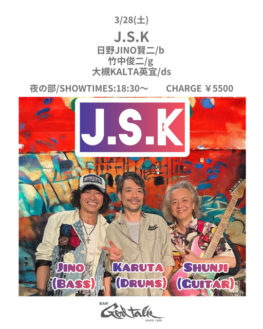 赤坂で誕生した奇跡のトライアル。説明不要のJino、Shunji、Karutaによる振り幅MAXのスーパートリオ! 3人が奏でる演奏を楽しもう。名手揃いのセッションBAND「JSK」再登場! ゴージャスなBEAT&GROOVEは必聴。日野JINO賢二/b・竹中俊二/g・大槻KALTA英宜/ds。