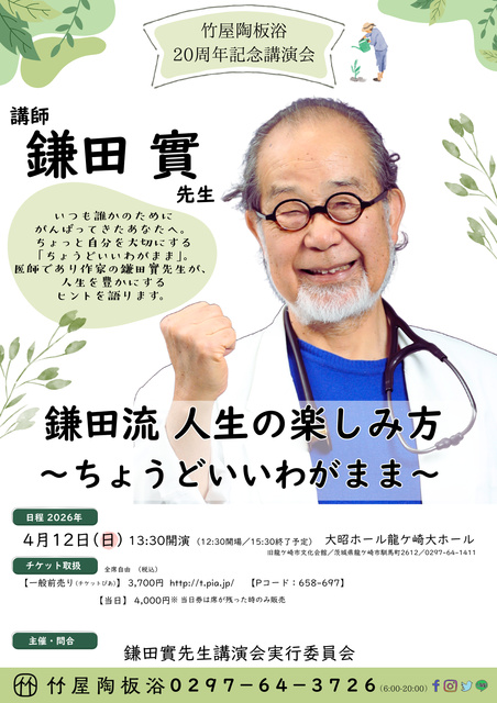 長野県を“長寿日本一”へ導き、ベストセラー『がんばらない』の著者、医師・作家の鎌田實先生が龍ケ崎に来場。人生100年時代に、健康と幸せを両立し軽やかに生きるヒントを、温かな語りで届ける。テーマは「人生の楽しみ方〜ちょうどいいわがまま〜」。直接その声を聴ける貴重な機会だ。