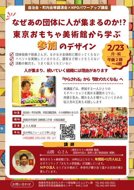 「役員や班長さんが、なかなか主体的に関わってくれない…」「イベントは実施しているけれど、運営まで担ってもらえない…」「活動の魅力を、うまく伝えられていない…」そんな悩みを抱える自治会・町内会や市民活動団体の皆さん必聴の講座。講座では、年間延べ1万人以上のボランティアが活躍する「東京おもちゃ美術館」の事例から、「やらされる」から「関わりたくなる」組織運営のコツと伝え方の工夫を学ぶ。