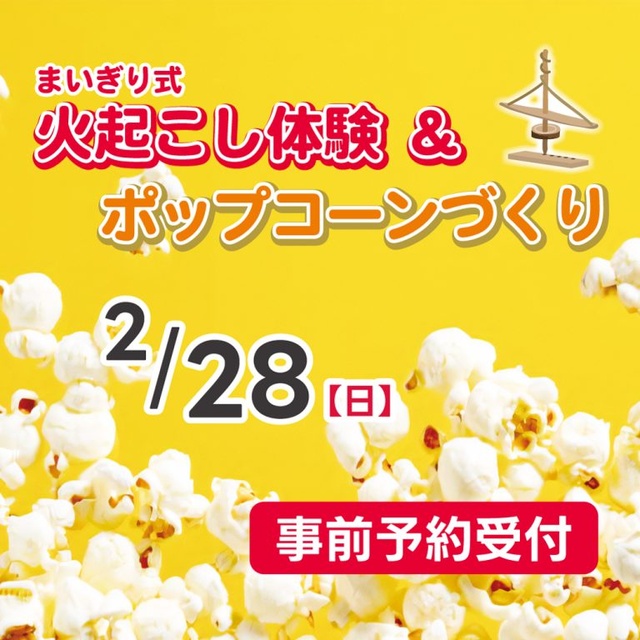 昔の人はどのように火を起こしていたのだろう?「まいぎり式」という火起こしの道具を使って、薪へ自分で火を付けてみよう!自分で付けた火を使って、ポップコーンを作ってみよう。