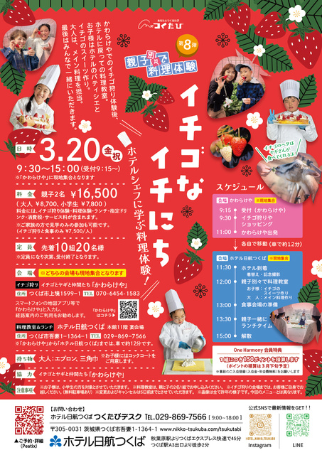 いちご農園(かわらけや)受付9:45~/イチゴ狩り体験10:30~10:45/ホテル受付11:30~/料理体験&食事12:00~15:00