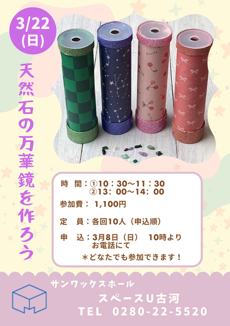 数種類の天然石の中から好きな組み合わせを選んで天然石の万華鏡をつくる。太陽にかざすとキラキラ光って見えるよ。申込は3月8日(日)10時よりTELまたは来館にて。小学2年生以下は保護者同伴。