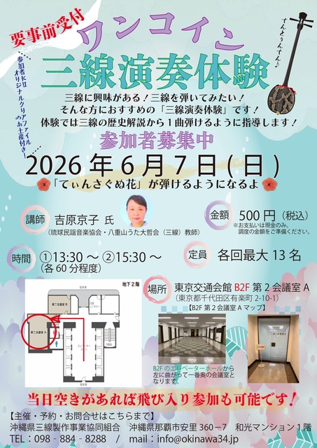 「ワンコイン三線演奏体験」を東京交通会館にて開催。今回の体験は『てぃんさぐの花』が弾ける様になる演奏体験。丁寧にわかりやすく指導してくれる。そして体験者にはお土産として、『三線組合オリジナルクリアファイル』を1枚プレゼト。ワンコインで大変お得な体験内容。三線を弾いてみたい、三線に興味がある人はぜひ参加しよう。