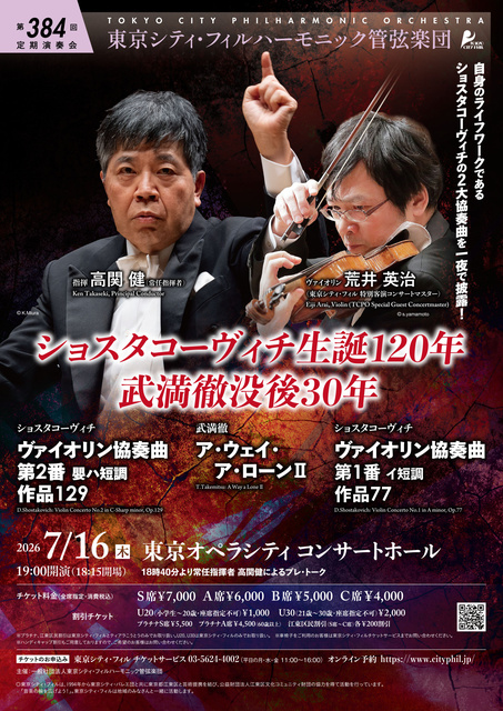 指揮は高関健(常任指揮者)、ヴァイオリンは荒井英治(東京シティ・フィル 特別客演コンサートマスター)。ショスタコーヴィチ生誕120年、武満徹没後30年。曲目は、ショスタコーヴィチ:ヴァイオリン協奏曲第2番 嬰ハ短調、武満徹:ア・ウェイ・ア・ローン2、ショスタコーヴィチ:ヴァイオリン協奏曲第1番。3月11日(水)よりチケット一般発売。