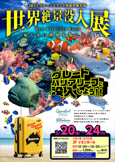 イオンモールつくばにて、「世界絶景没入展」を初開催する。世界絶景没入展は「さぁ世界の絶景を観に行こう」をコンセプトに、世界中のあらゆる絶景を写真や謎解きクイズなどで学び、ドーム映像やVR体験などで没入する体験型ミュージアムである。第一弾は~世界遺産~「グレートバリアリーフ」。世界最大のサンゴ礁群を誇る広大な海を没入体験できる、大人から子供まで楽しめるイベントとなっている。