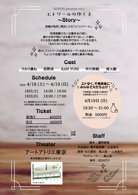 カフェでの演劇公演。【あらすじ】両親が他界し閉店したカフェ「エトワール」。料理経験のない近藤昌也の前に、謎の女性が現れ「店を継がせてほしい」と頼む。その女性の指導で料理を学び再オープンを目指す。「あなたならできる」と励まされた昌也。果たしてエトワールは無事再オープンを迎えられるのか。ちょっと不思議で温かい、挑戦と継承の物語。対象:16歳以上
