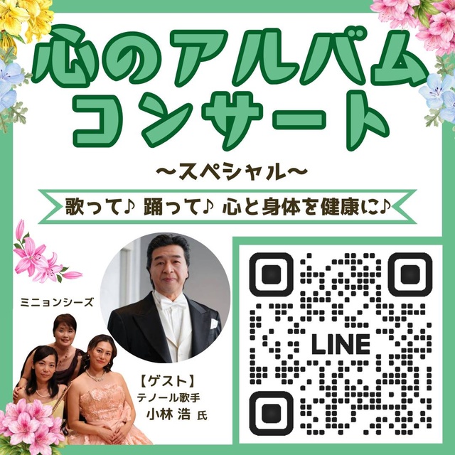 三芳町ふるさと大使ミニョンシーズによる観客参加型のコンサート。歌とフルート、ピアノによる演奏で「音楽で心も体も健康に」をテーマに、昭和歌謡など懐かしの名曲を歌ったり踊ったり、クイズも交えて心と体のリフレッシュを図る。第5回記念公演としてテノール歌手・小林浩をゲストに迎える。音楽健康指導士資格を持つソプラノ歌手が司会進行を務める。詳しくは「ミニョンシーズ」で検索。令和8年度三芳町芸術文化支援事業