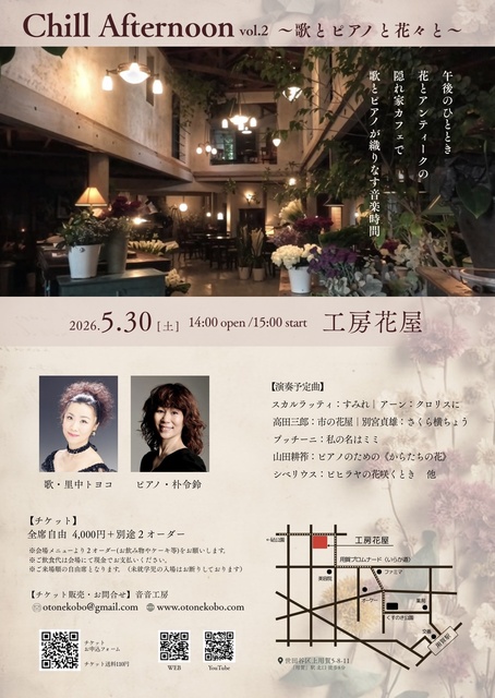 午後のひととき、花とアンティークの隠れ家カフェで、歌とピアノが織りなす音楽時間。「花」にちなんだクラシックの歌曲とピアノ曲を届ける。開場中、休憩時にはドリンクや軽食の提供あり。