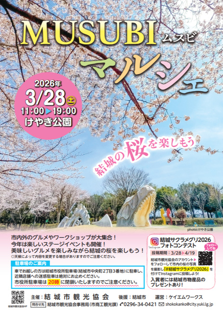市内外のグルメやワークショップが大集合! 楽しいステージイベントも開催する。グルメを堪しながら結城の桜を楽しもう。また、MUSUBIマルシェ当日の3/28からは、市内の桜の写真を撮影して、インスタグラムに投稿するフォトコンテスト「結城サクラメグリ2026」を実施(4/19まで)。お気に入りの桜の写真を投稿して、結城市の桜をPRしよう。