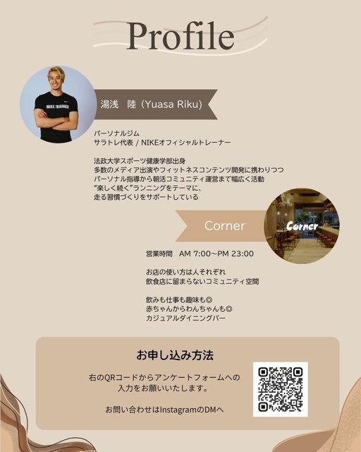 Cornerの利用者でもある陸さんと夜・朝ランニング!12月からは、はじめてのランニングメンバーが増えている。楽しく走った後はCornerのごはんやドリンクを提供。ストレッチ、ランニング、アットホームな交流会という感じで、気兼ねなく参加できる会。アイスブレイク&ストレッチ、陸さんおすすめコースをランニング。5kmほどを1kmあたり6分30秒〜7分程度で走ろう!
