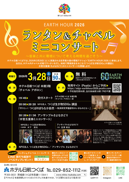 ホテル日航つくばでは、世界最大級の環境アクション「EARTH HOUR 2026」に参加する。当日は、ホテル内チャペル式場でランタンを灯し、地域で環境保全をおこなう『つくば生き物SDGs』の講話と木管五重奏『アンサンブルさよなきどり』のミニコンサートを開催する。音楽と共に環境について考える時間を過ごそう。